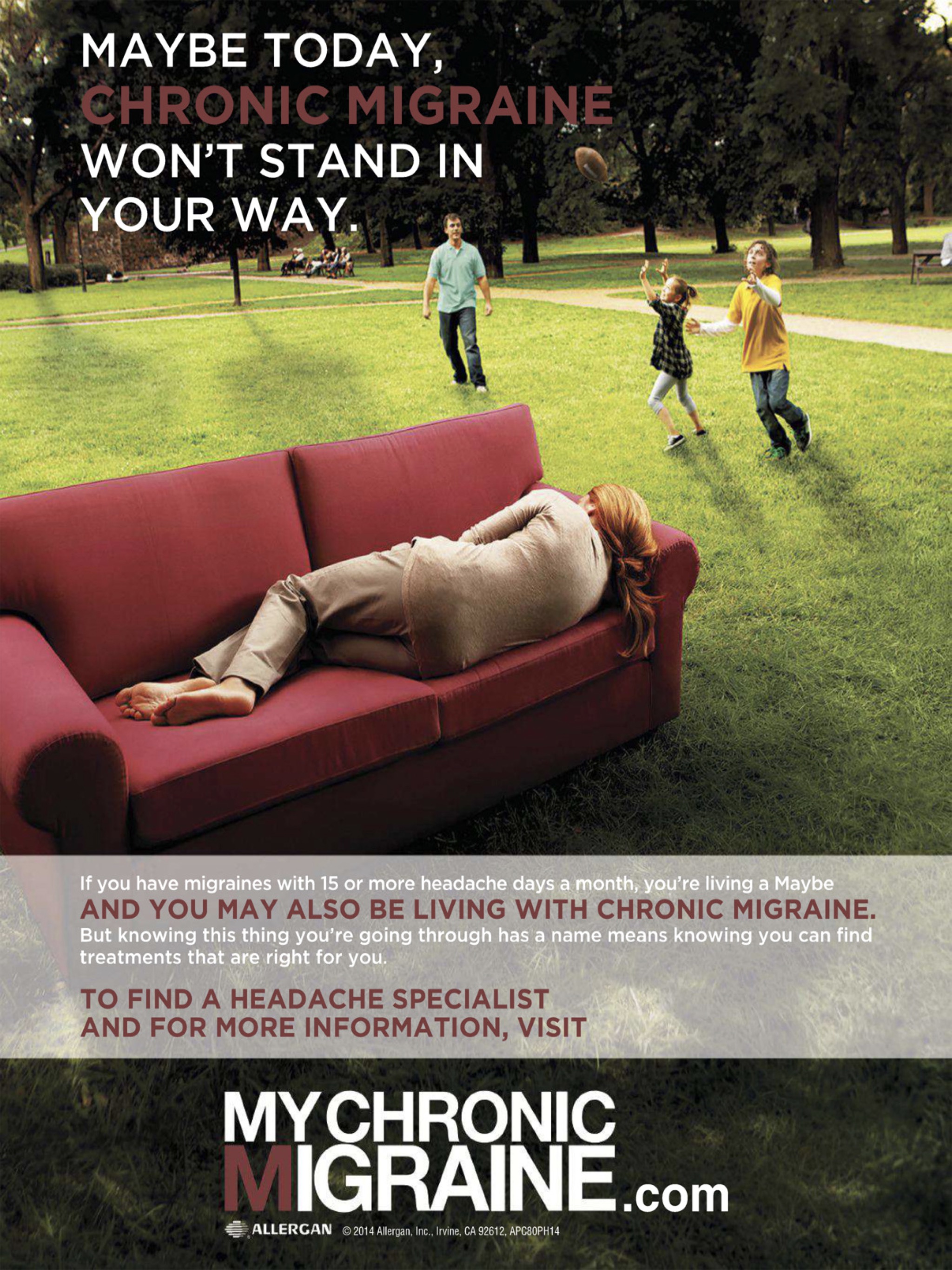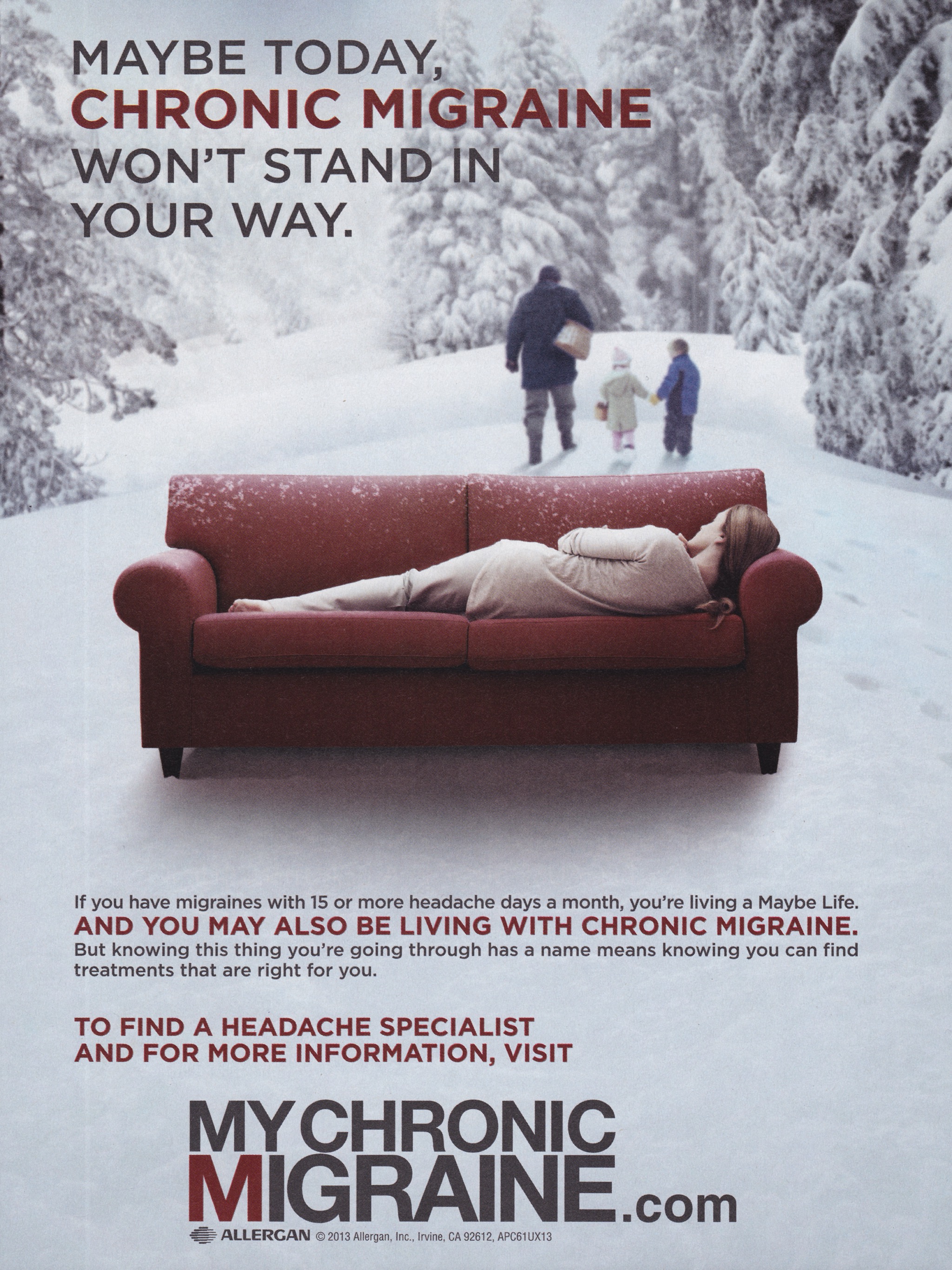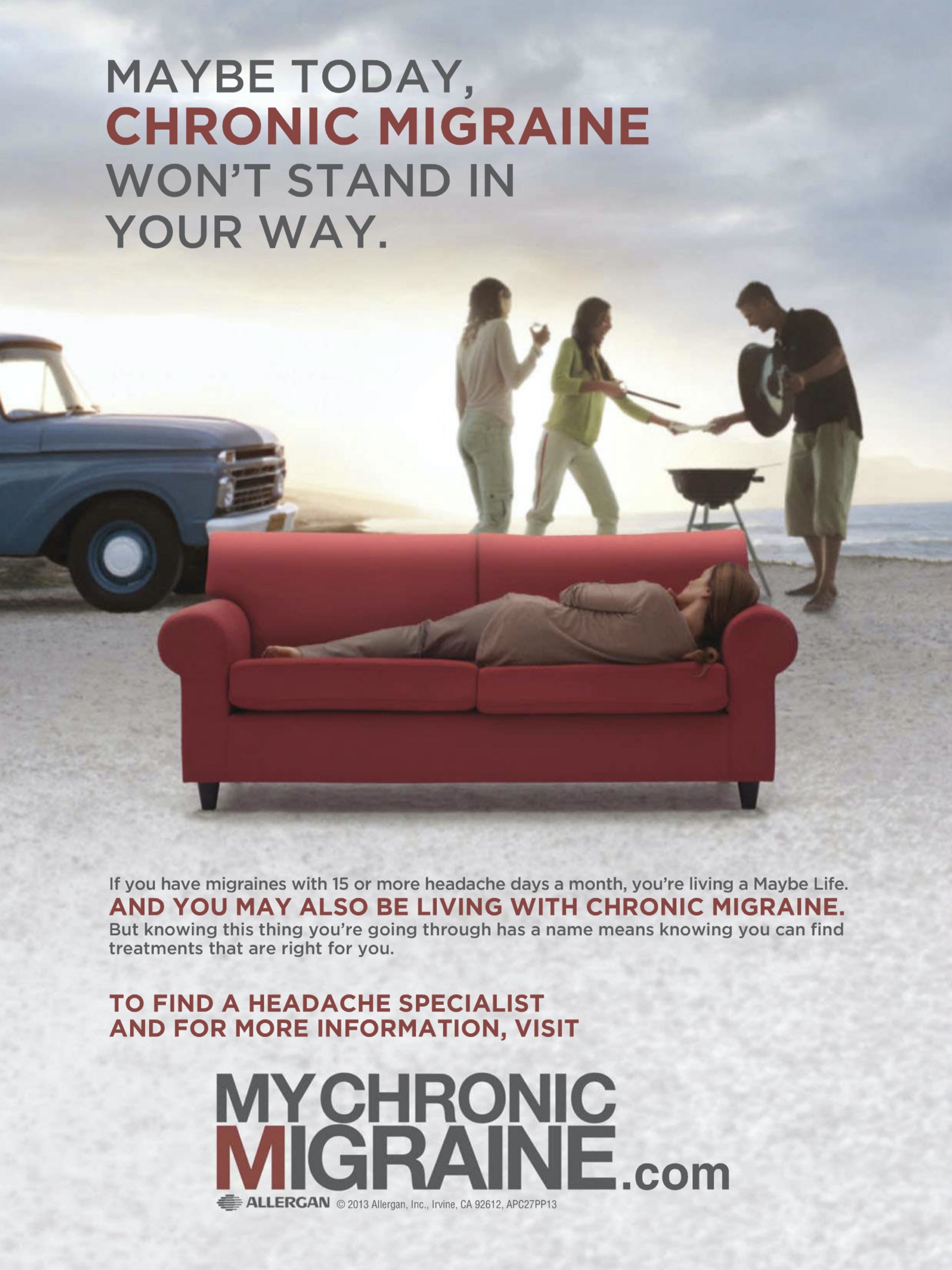 3.3 million people in the United States are living with Chronic Migraine. Nearly 2/3 of people who are living with Chronic Migraine have not been properly diagnosed.